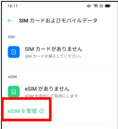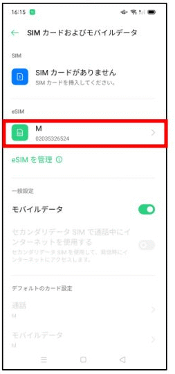 「ホーム画面より「設定」を起動 「SIMカードおよびモバイルデータ」をタップ インストールされたeSIMを選択します。